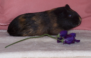 Billy was very special because soon after we had him when he was just 6 weeks old, we noticed that his breathing was always very deep and he tended to snort a lot. After investigation by the Vet, it turned out that he had a much enlarged heart, which had distorted his windpipe so he had to adjust his breathing accordingly. This was something he was obviously born with and he was on medication for most of his life to keep his lungs clear. He coped fantastically well with his condition and it never caused him any distress. Billy was a very placid, friendly little piggie with black with ginger markings, and although somewhat of a lazy boy, he did love to popcorn and run around the hall when it suited him. He also loved to sit with us on his blanket for hours on end. Well when I say sit, I actually mean lie down on his side with his legs out ! Of all the guinea pigs we have had, I think Billy had the biggest appetite, seemingly never turning away any opportunity for more food.