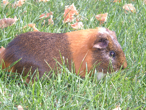 Rusty was very pretty (and she knew it!) She behaved like a princess expecting and often taking the best on offer! She certainly made herself the matriarch and so Crusty had to tow the line! We had two big indoor cages and connected them together to make a guinea palace for them. So many times Rusty would search out Crusty and boot her out of wherever she was. But despite their differences they would often snuggle up together. Rusty became an old lady surviving Crusty by nearly two years. She seemed fine but then suddenly stopped eating; nothing would tempt her, not even her favourite grass. We were with her when she passed away on 16th July 2007.